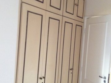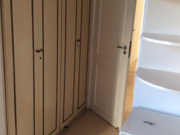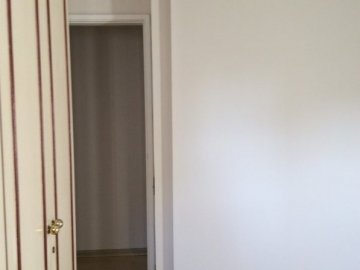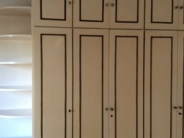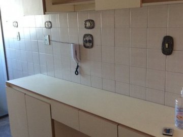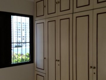 Cozinha, quartos com armários e banheiros com gabinetes e box.