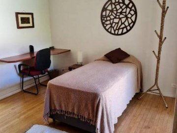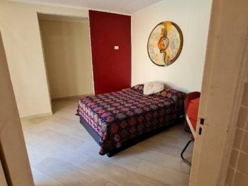 Dormitório com 2 ambientes, um com cama de casal, outro com cama de solteiro, armários embutidos, bancada para escritório e banheiro ao lado;