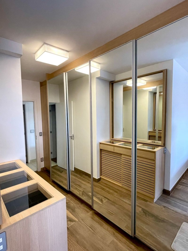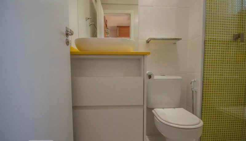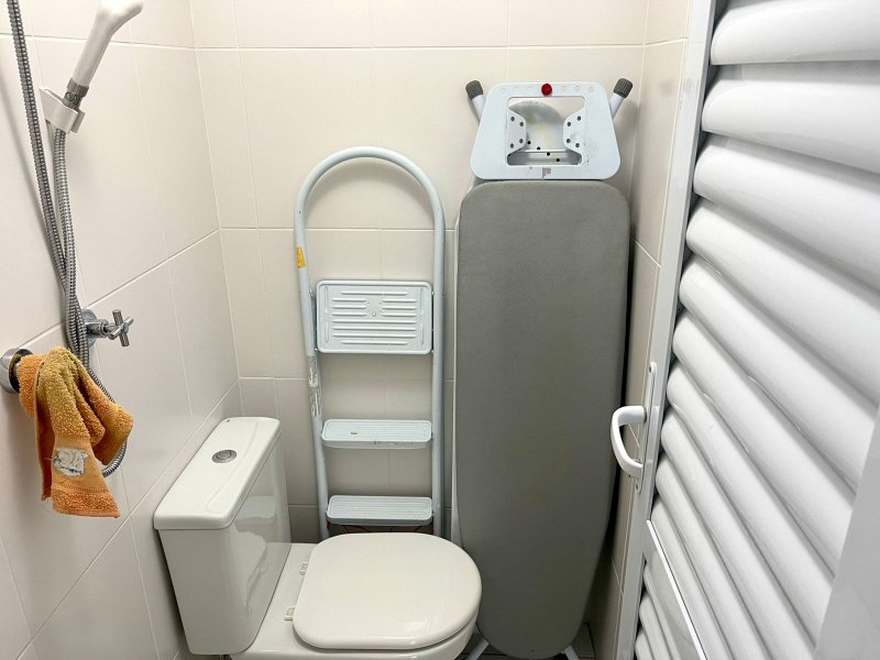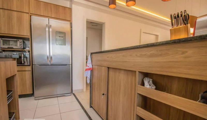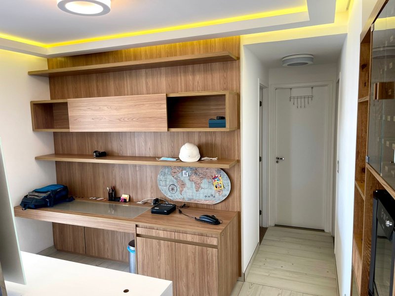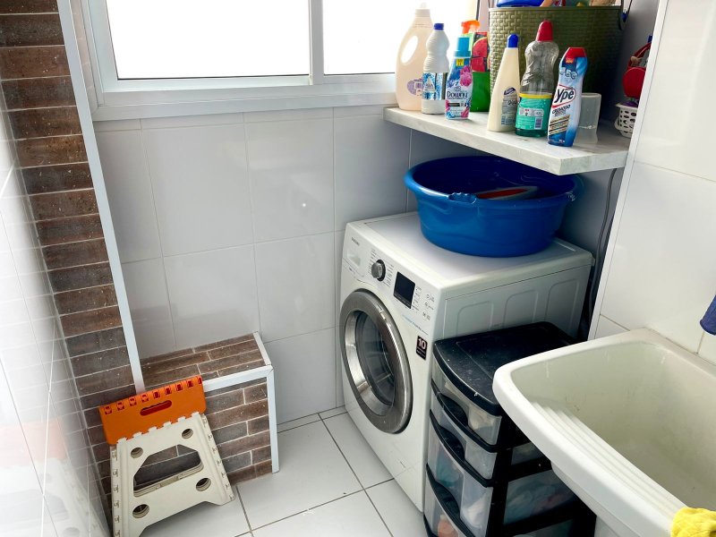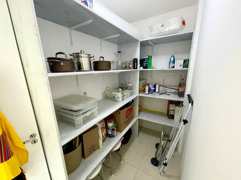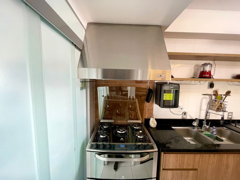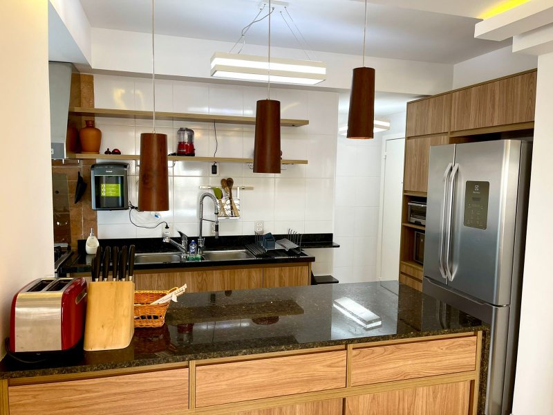 Box, Varanda, Armários embutidos no quarto, Armários nos banheiros, Armários na cozinha, Ar condicionado, Chuveiro a gás, Geladeira inclusa, Cozinha americana, Área de serviço