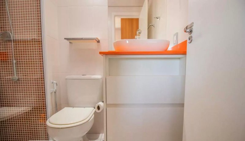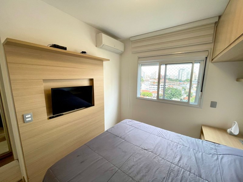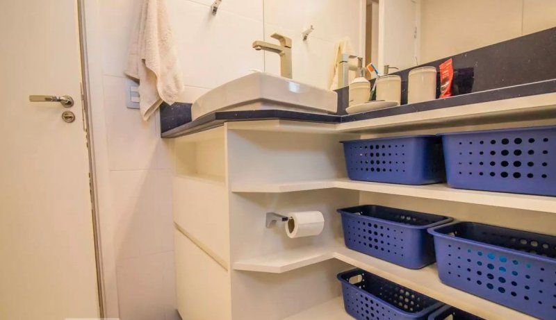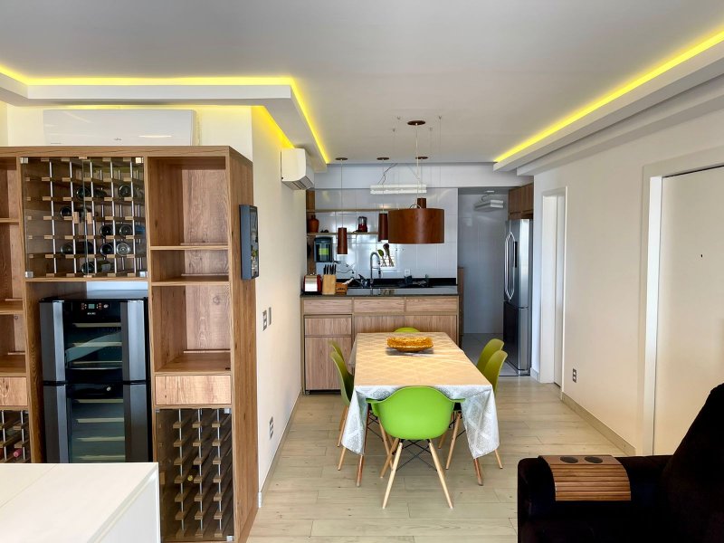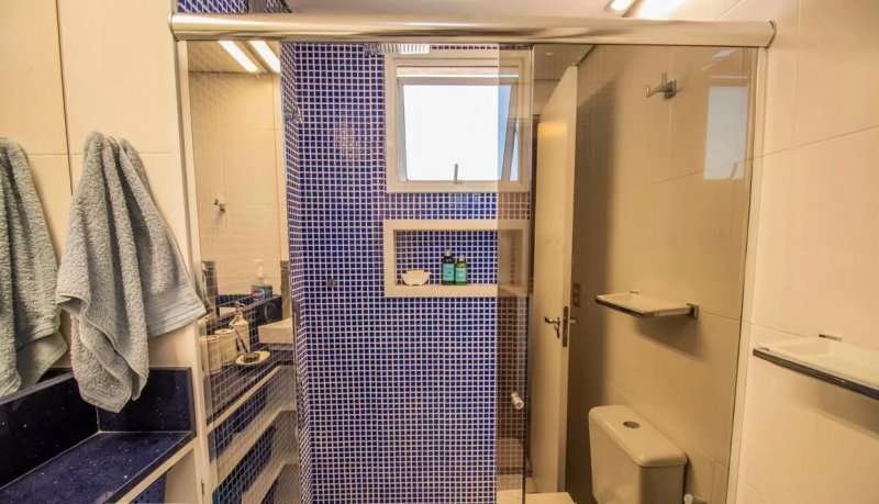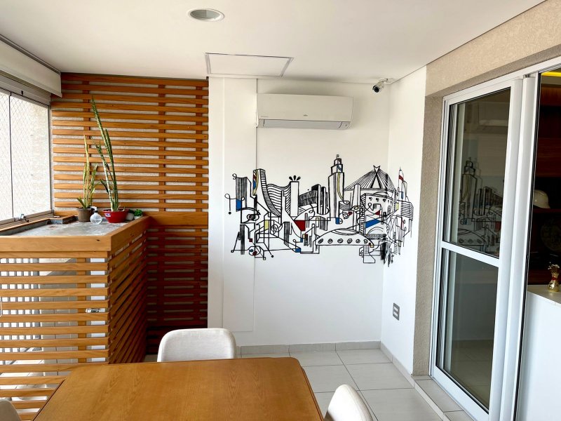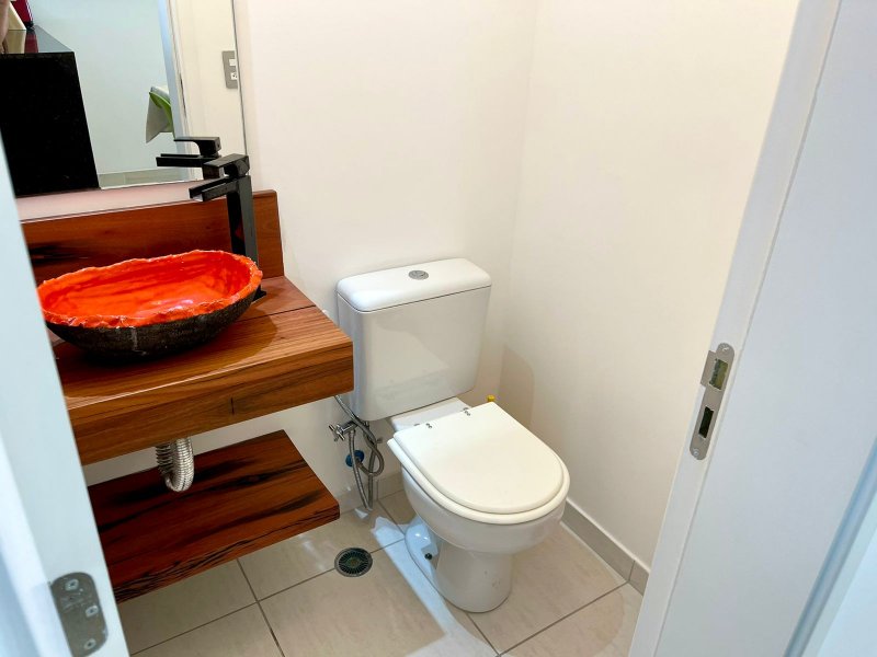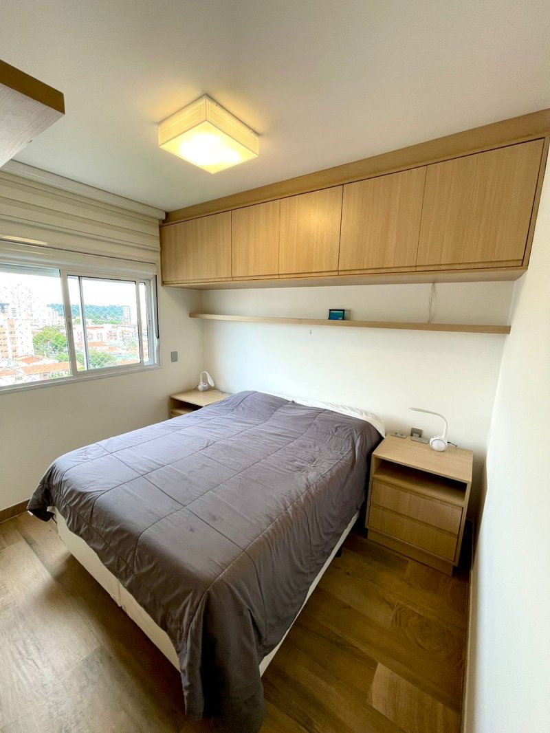 Box, Varanda, Armários embutidos no quarto, Armários nos banheiros, Armários na cozinha, Ar condicionado, Chuveiro a gás, Geladeira inclusa, Cozinha americana, Área de serviço