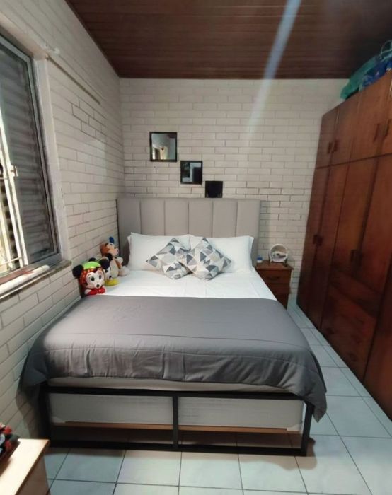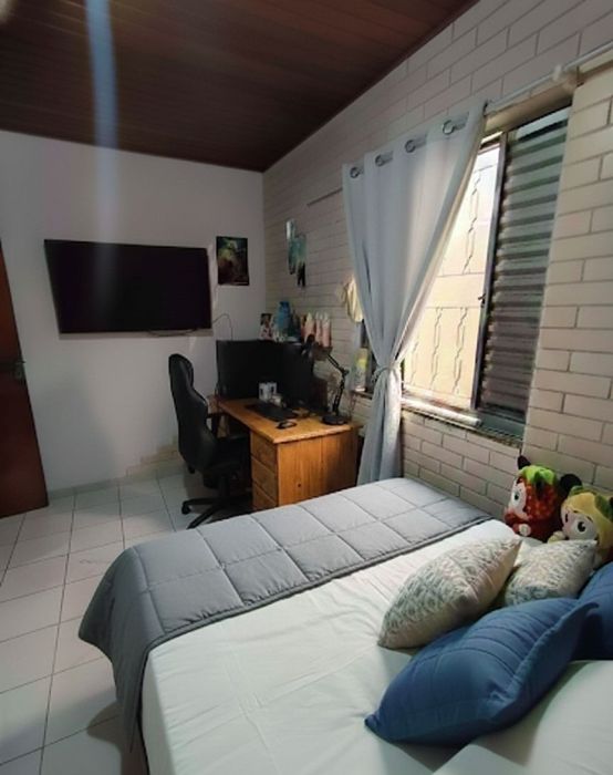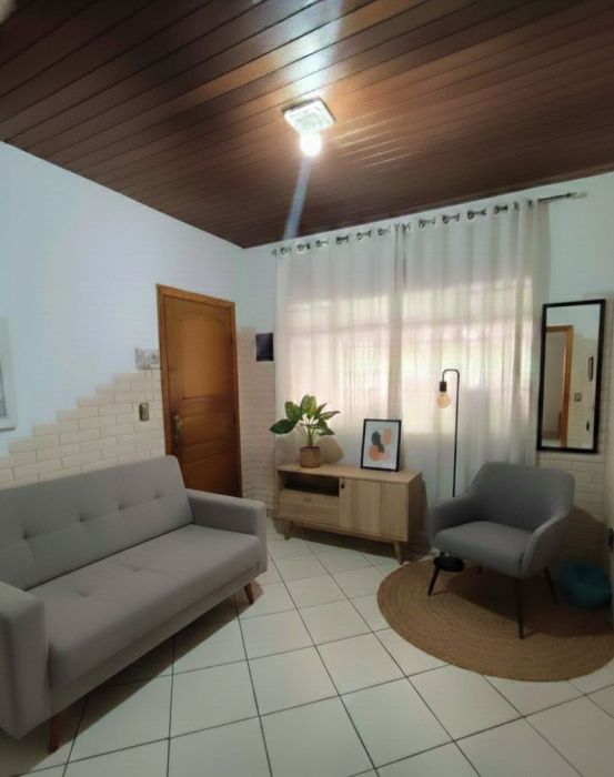 A planta interna é composta por dois dormitórios, sala de estar arejada e um banheiro social. A área de serviço é separada, garantindo melhor organização doméstica, e a cozinha possui dimensões que favorecem a rotina diária. Um dos grandes diferenciais do imóvel é a presença de uma churrasqueira, proporcionando um espaço dedicado ao lazer privativo. Além disso, a casa dispõe de duas vagas de garagem, um recurso essencial para a região.