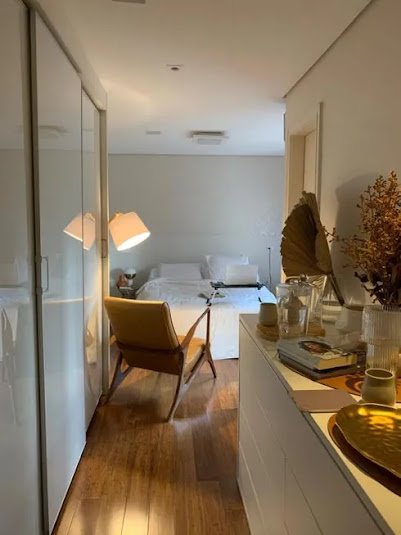 Apto com móveis planejados, ar condicionado e piso de tábua corrida em todo apartamento.